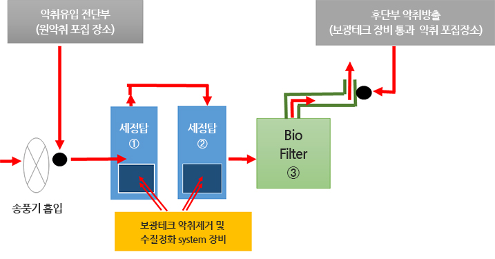 음식물처리장, 퇴비 발효장 등 각 산업체의 기타악취가 발생하는 모든 장소에서  최대한 악취를 쉽고 간편하게 제거할 수 있는 기계 설비를 보광테크에서 동종업체와 기술을 제휴하여 개발, 특허, 신기술인증(NET)를 득한 후 생산하여 각 현장에 판매하고 있으며 악취 제거 및 수질 정화(스크러버 순환수) 대기 공간 악취 제거 설비 B,K TOTAL SYSTEM을 각 현장에 접목해본 결과 모든 악취를 약 90% 이상의 악취제거 효과를 나타내고 있으니 환경 관리 업무에 참조하시기 바랍니다.