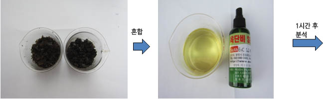 2. 각기 100g의 시료에 악취제거제 옥단비 옥단비-ZERO, 타업체 악취제거제를 각각 5cc 또는 무투입한 후 잘 흔들어 혼합하여 방치한다.